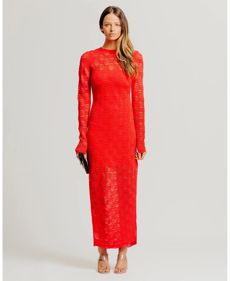 The Cheryl Dress is crafted from fully fashioned knit, providing a smooth and comfortable fit. It features sheer fabric detailing at the sleeves, yoke, and hem, adding an elegant and delicate touch. The dress includes side slits for ease of movement and a contemporary look, and it is finished with a classic crew neck for a timeless silhouette-perfect for cocktail receptions, dinner parties, or evenings that call for understated elegance.