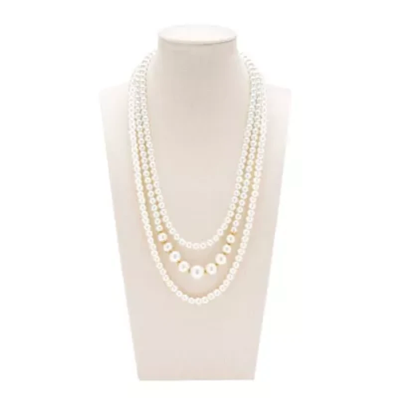 Exuding class, style, and timeless elegance, the Martha Stewart fashion jewelry collection is a true celebration of sophistication. This exquisite collection highlights distinctive chains, iridescent glass pearls, and dazzling crystals, all crafted with yellow gold-plated metal. Each piece reflects Martha Stewart's signature flair, offering a blend of uniqueness and refined style. This Martha Stewart necklace features three strands of iridescent glass pearls with the biggest iridescent glass pearl measuring 10mm. The chain lengths are 16, 18 and 22 inches. This necklace is in yellow gold-plated brass metal and has a lobster claw clasp with a three inch extender. Lobster closure Polished finish Choking hazard Warranty available China Imported Product Specifications 15mm, 22 Inches Material & Care Metal, Gold plated Clean with a soft cloth.