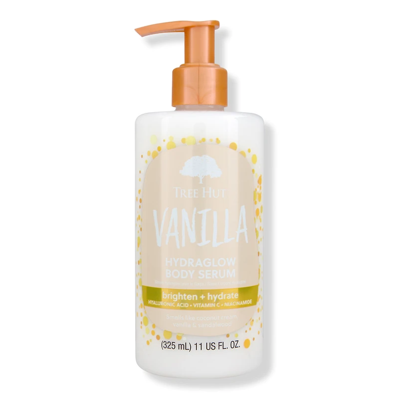 HYDRAGLOW BODY SERUM VANILLA. Benefits: This lightweight, ultra-hydrating formula helps brighten skin tone and deeply hydrate, leaving your skin feeling soft, radiant, and refreshed. Non-sticky formula absorbs quickly into skin. Long-lasting hydration. Paraben-Free, Sulfate-Free, No Formaldehyde Donors and Long-Lasting Fragrance. Features: A warm, creamy vanilla bean scent that wraps you in comfort. Top - vanilla. Middle - sandalwood. Base - coconut cream. Key Ingredients: Hyaluronic Acid helps boost skin barrier to improve hydration. Vitamin C helps even out skin tone for a natural glow. Niacinamide promotes brighter-looking skin and helps support skin barrier.