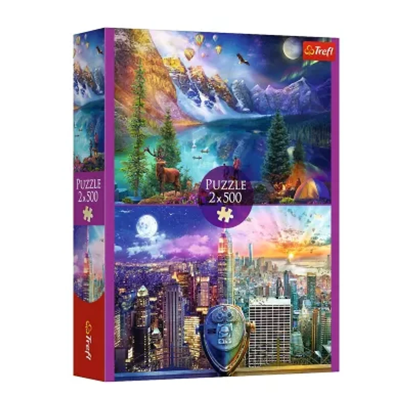 Experience the serene beauty of the great outdoors with our 500-piece puzzle featuring a peaceful lake, deer, and a cozy camping scene. Then, switch gears and marvel at the dazzling skyline of New York City from an observatory with our second 500-piece puzzle.