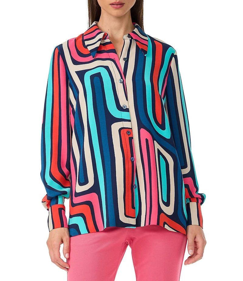 From Trina Turk, this shirt features: Printed georgette fabrication Point collar neckline Long sleeves Straight hem Button front closure Approx. 28" length Polyester Machine wash Imported.