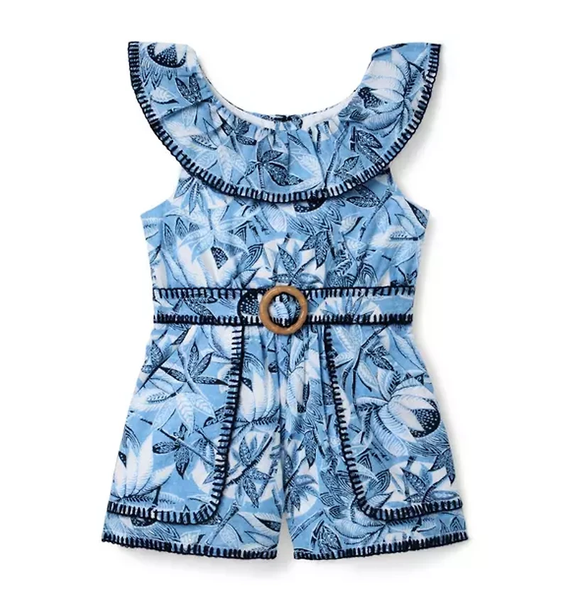 A trending tropical print makes this one-and-done romper an instant love. Designed in pure cotton with a ruffle collar, belt detail and pockets too. 100% Cotton Batiste; Lining: 100% Cotton Fully Lined Sleeveless Button Back; Front Pockets Matching Family Styles Available Online Exclusive Machine Washable; Imported