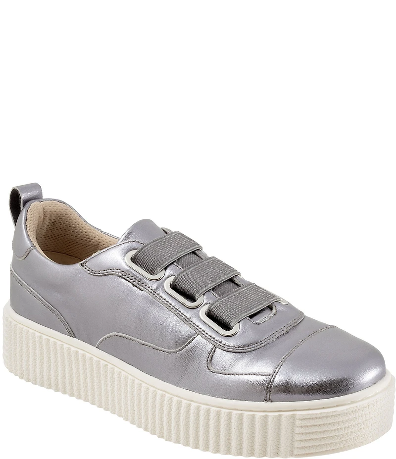 From Trotters, the Bliss Leather Slip On Platform Sneakers feature: Leather upper Slip on with elastic gore bands Polyester lining Removable footbed ensures customizable comfort and accommodates orthotics TPR outsole Approx. 1.5" platform height Imported.