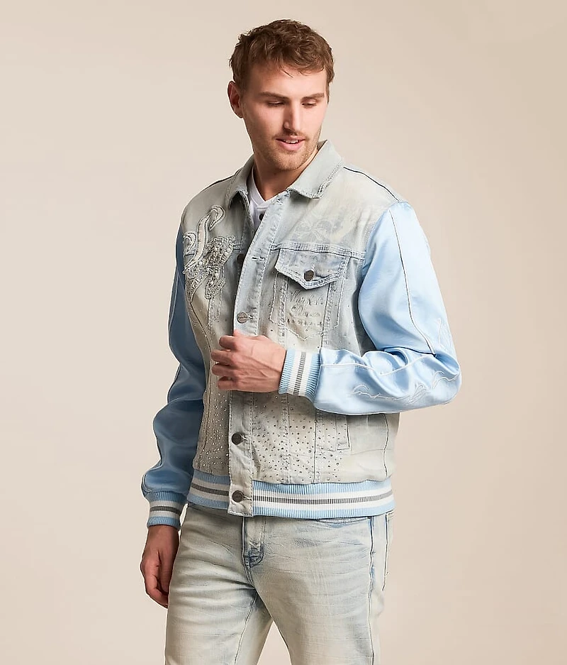Faux pearl and rhinestone button front jacket Contrast satin sleeves Embroidered sleeve hits Frayed details
