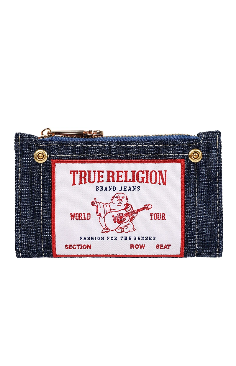 Iconic style in a compact essential. The True Religion Buddha Patch Small Wallet delivers signature brand attitude in a slim, everyday design crafted from classic dark denim. Featuring the instantly recognizable embroidered Buddha World Tour patch on the exterior, this wallet channels True Religion's heritage with a bold, vintage-inspired edge. Designed for functionality without bulk, the interior opens to reveal multiple card slots, a clear ID window, and slip pockets to keep your essentials organized. A top zip coin compartment with a signature horseshoe zipper pull adds secure storage and a polished finishing touch. Durable stitching and contrast details complete the look, making this wallet both stylish and practical. Perfect for daily use or tossing into your favorite True Religion tote, this small wallet proves that iconic design comes in compact form