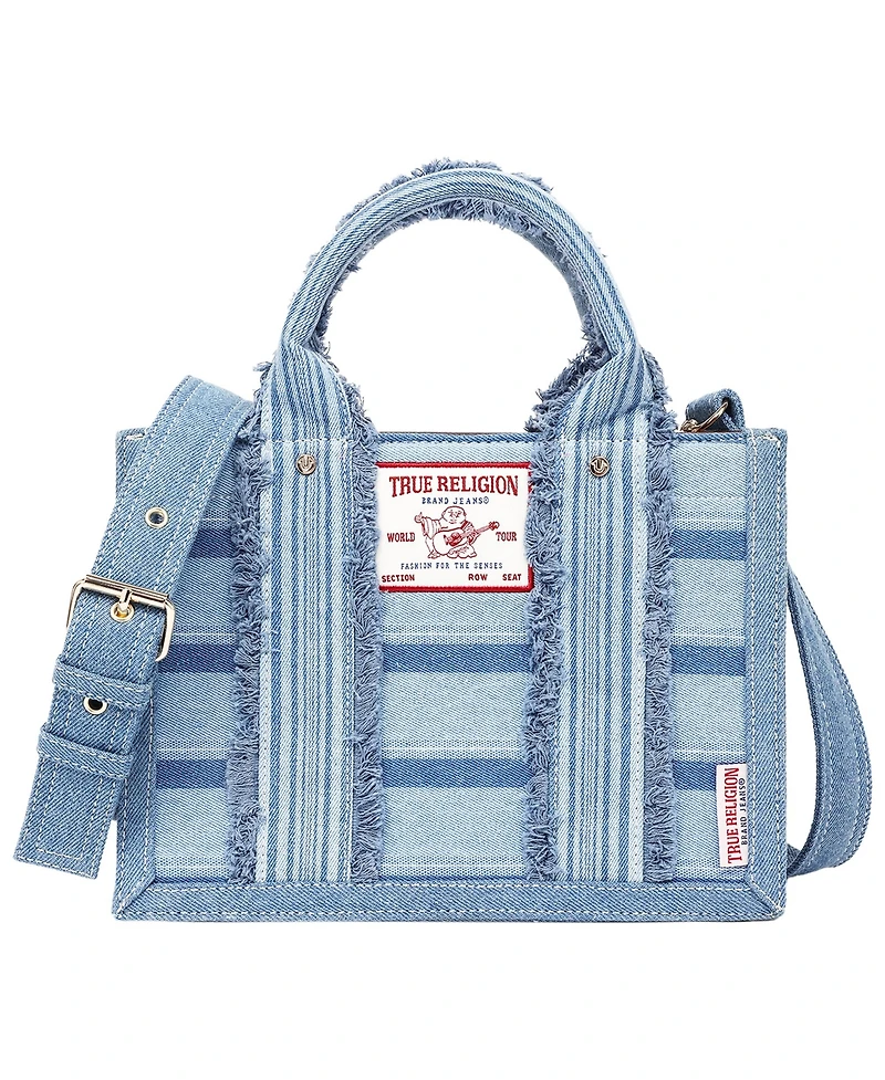 Make a statement with denim that does more. The True Religion Multi-Stripe Modern Tote blends iconic brand heritage with a fresh, contemporary silhouette, featuring layered denim striping and raw-edge detailing for a bold, fashion-forward look. Designed for everyday versatility, this structured tote offers dual top handles for easy carry and includes a removable, adjustable crossbody strap to take you hands-free when you need it. The open top reveals a thoughtfully organized interior with space for daily essentials, while signature True Religion branding adds an authentic finishing touch. Whether you re heading out for errands, brunch, or a casual day out, this tote delivers effortless style with unmistakable True Religion attitude.-Officially licensed True Religion product