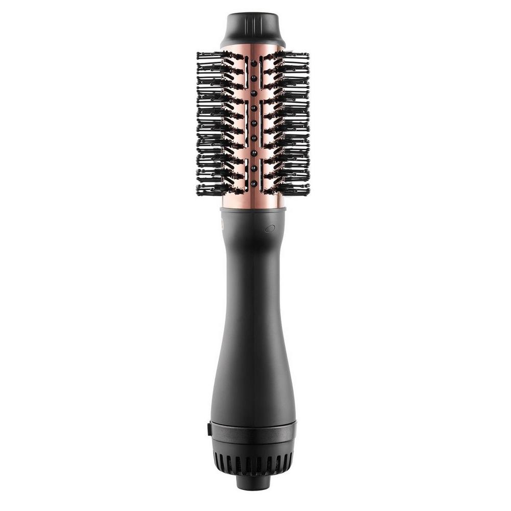 VOLUMIZER Hot Air Brushes Black. Benefits: Professional one-step styler,multi-functional blow dryer,volumizer,straightener,and curler. Nano titanium barrel protects hair from over-styling and the millions of negative ions reduce frizz and static while repairing damaged hair. Innovative 360vent offers 50% bigger drying area to fast dry hair and create salon long-lasting hairstyles in minutes. Features: Patent bristle design for salon results with a smooth-touch bristle design for close contact at the root to add extra lift and help detangle hair; while providing anti-scald protection as they massage the scalp. Multiple temp control for styling flexibility,three settings for various hair types and needs. low heat with high speed,medium heat with low speed, and high heat with high speed. Rotating adjustable button at the bottom of the handle to avoid accidental touching during the use. Key Notes: 360swivel cord. Powerful 1200W motor.