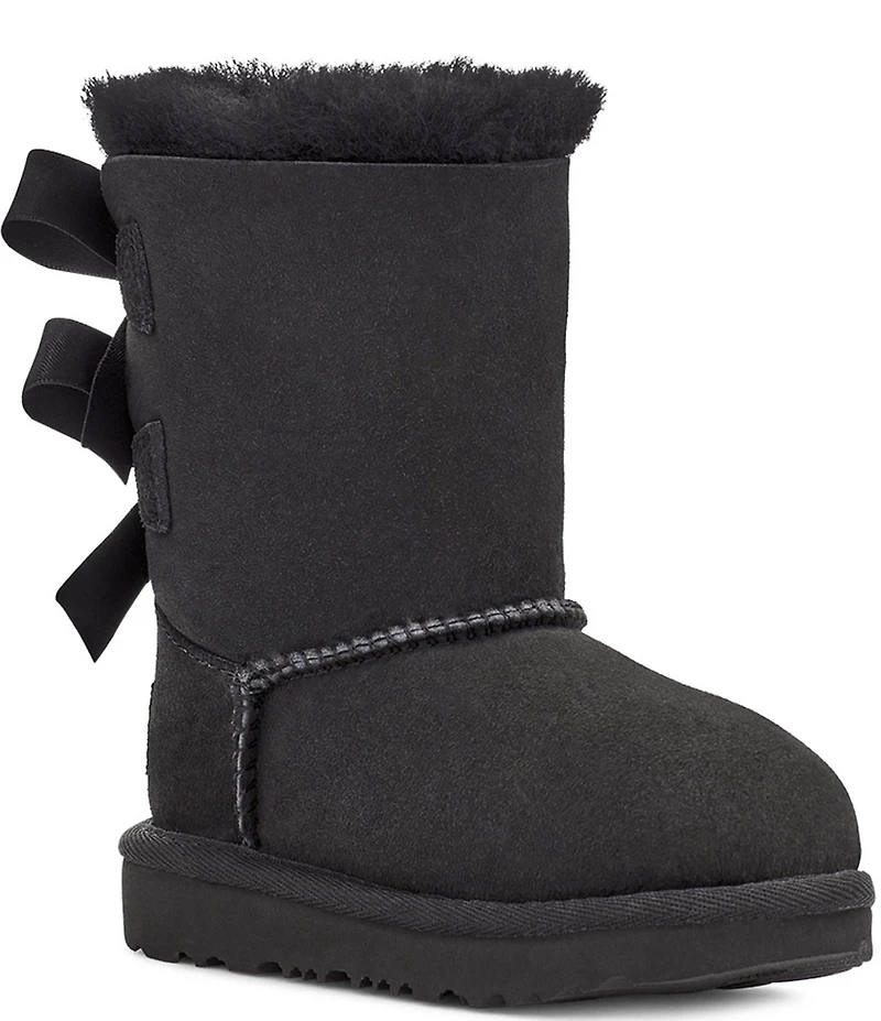 From UGG®, the Girls' Bailey Bow II Suede Water Resistant Family Matching Boots feature: Twinface upper Artificially dyed and treated real sheepskin from sheep or lamb (Australia, European Union or United States) Pretreated to repel moisture and stains Fixed bows along rear shaft pull on construction Cushioning foam insole lined with UGGpure™ wool Nylon binding Treadlite by UGG™ outsole Approx. 7.5" shaft height Imported.