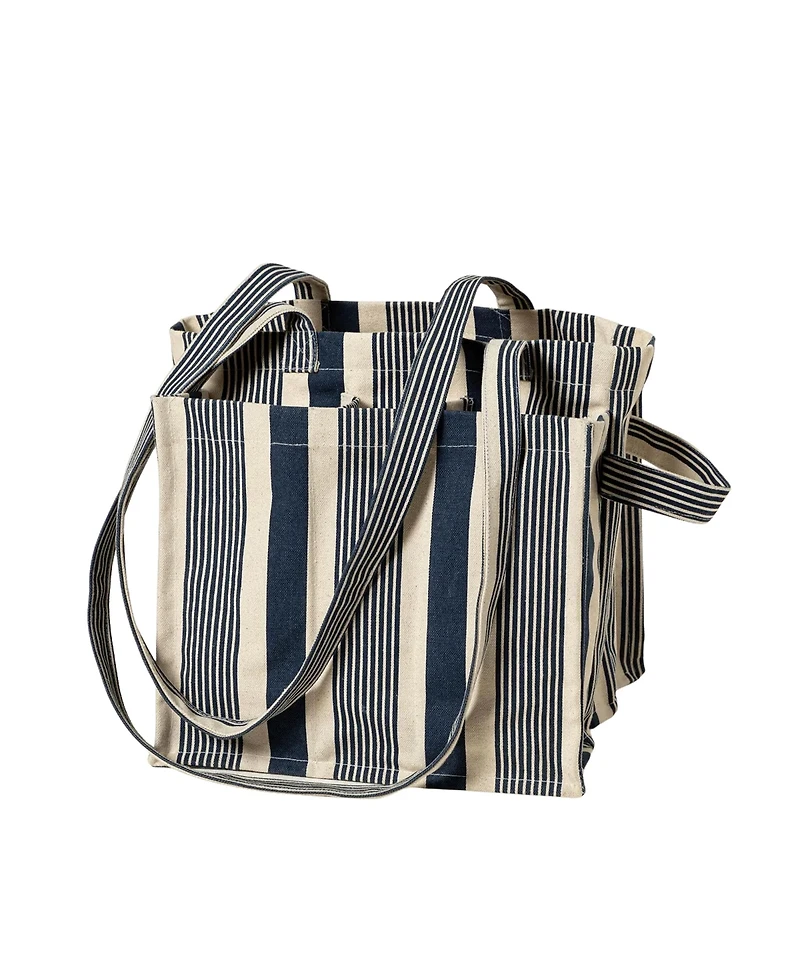 A smartly designed tote that knows how to get fresh produce, eggs, and flowers home from the market in great shape. Strong, durable cotton with bold navy and white stripes features a spacious interior, with exterior pockets for bottles.