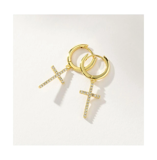 Gold Plated Sterling Silver Cubic Zirconia Cross Huggie Earrings