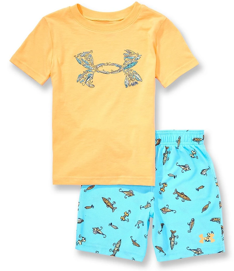 From Under Armour, this 2-piece set features: Solid T-shirt with crew neckline and short sleeves plus Under Armour big icon logo detail on the chest and pullover styling Fishing lure-printed shorts with pull-on styling and an encased elastic waistband plus relaxed gusset and a full cut with unrestricted movement T-Shirt of super-soft cotton/polyester to help keep you cool and dry; shorts of polyester interlock Machine wash/tumble dry Imported.