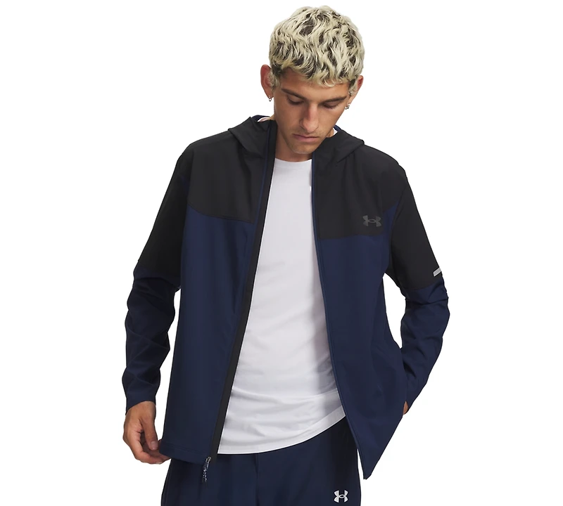 Engineered for training, this jacket by Under Armour features a water-resistant finish and secure pockets for versatile performance. Lightweight stretch-woven construction moves with you in every direction for superior comfort. Reflective details enhance visibility during your workouts.