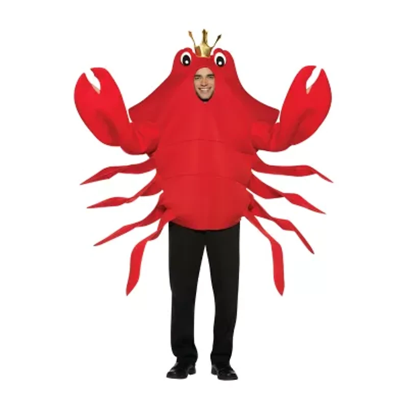 King crab costume adult. Be the hit of your next beach party with this great king crab costume. Great for mardi gras too! The costume includes red tunic with hood headpiece that has googly eyes and tentacles and matching crab claw mitts. One size fits most adults upto Large. pants and shoes not included.