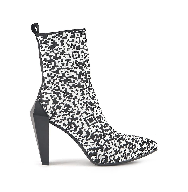 The Gem Bootie Hi is a high-heeled bootie with a leg-hugging sock knit upper. It features a tonal silhouette, a pointed-toe and a distinct gem-shaped block heel. Lightweight matte-finished Abs heel.