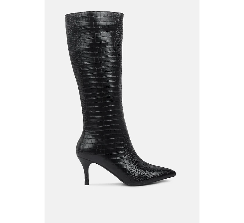 Mid Heel pointed toe calf boots with side zipper fastening looks gorgeous, raises style and comes with an easy to wear side zipper fastening.Outer material: Croc PULining Material: SyntheticOuter sole: TPRPointed ToeStiletto BootSide Zipper OpeningCalf BootsPointed High HeelsElasticated GussetSH3294
