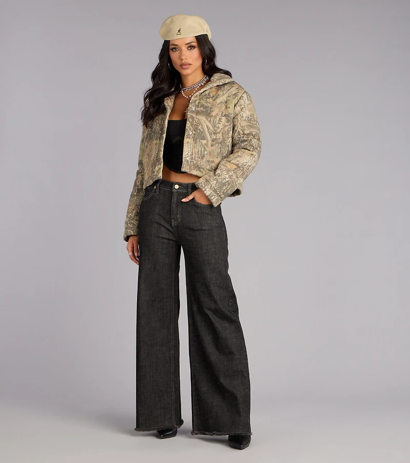 Your cold-weather edge, unlocked. This camo puffer jacket brings structured warmth with a soft quilted feel and a button-up front—made for styling with denim or leggings for a streetwear vibe.