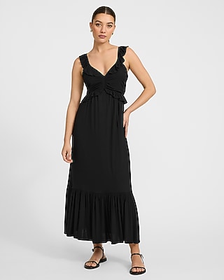 A maxi dress with a comfortable flowy fit. This classic ruched sleeveless maxi features a v-neckline, ruffles around the straps and bodice, a tired skirt, and a flattering back cut out.