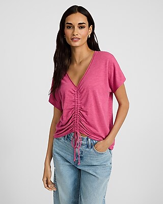 A slub tee complete with short sleeves, a v-neckline, and a ruched tie front detail.