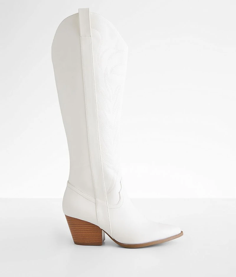 Embroidered faux leather pull-on cowboy boot Side zip detail Cushioned footbed 17 1/2" shaft 16" calf circumference 2 3/4" heel