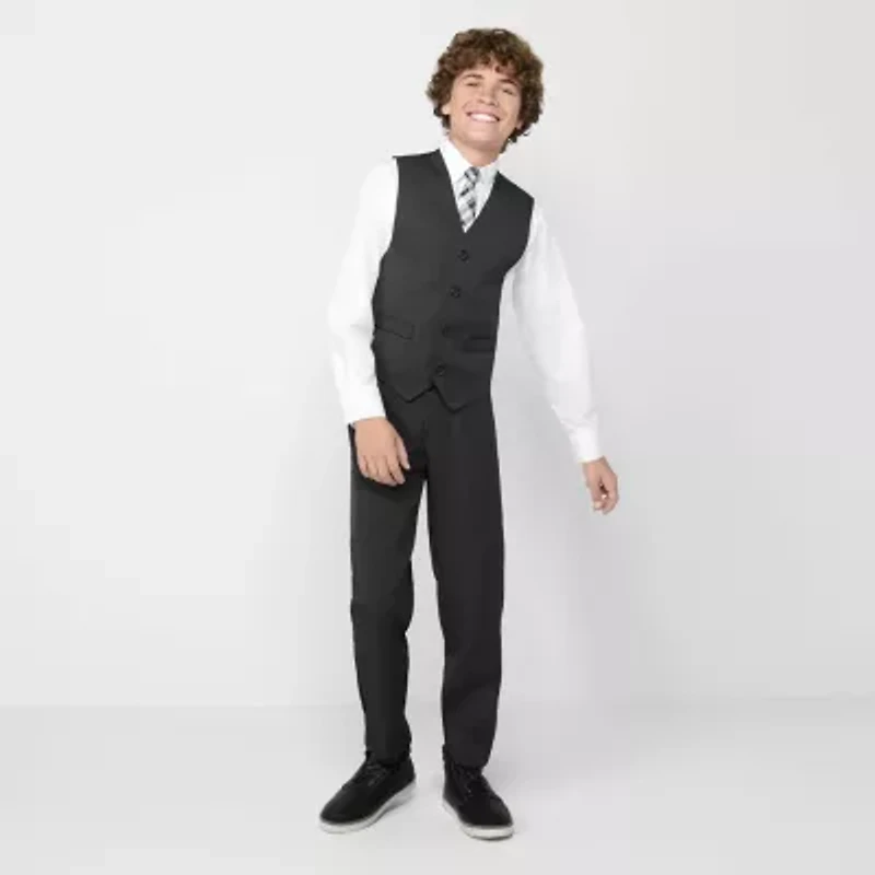 Dress him like a gentleman with Van Heusen's Little & Big Boys 4-pc. Suit Set. This complete ensemble includes a vest, pants, shirt, and coordinating tie for effortless style and polished charm. The perfect choice for special occasions and making a lasting impression.