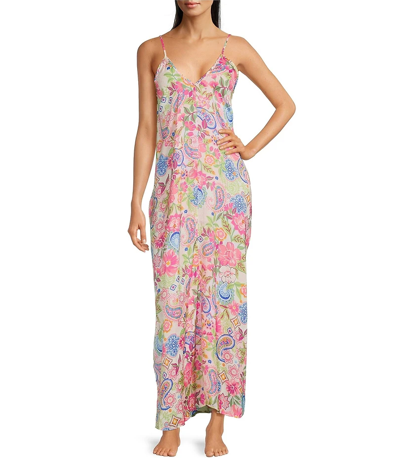 From VAN WINKLE & CO., this chemise features: Paisley print Washed satin fabrication V-neckline Sleeveless Adjustable straps Side seam pockets Side slits Maxi length Pullover construction Polyester Machine wash cold/tumble dry low Imported.