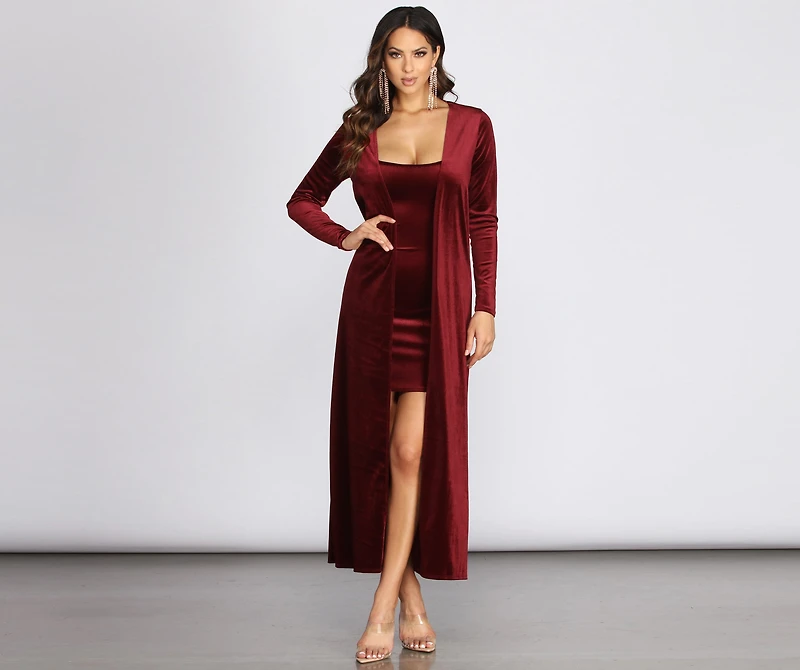Heat up your look with the Velvet Luxe Duster. Pick up the matching velvet mini dress to complete the look! (05101-0349)