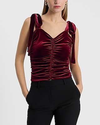 A velvet tank with a ruched bodice, sweetheart neckline, and tie strap details.