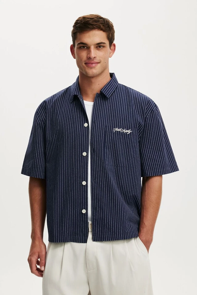 A relaxed, boxy-fit short sleeve shirt cut from cotton. The Ventura Short Sleeve Shirt is designed with a classic collar, single chest pocket, and straight hem for a laid-back resort feel. Finished with a cropped length and textured weave.