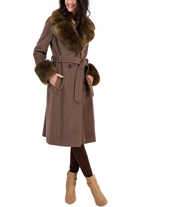 Cole Haan Wool Blend Faux Fur Trim Belted Wrap Coat