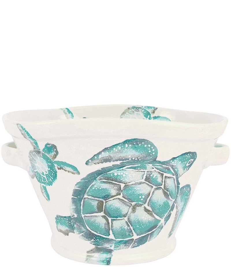 From VIETRI, this Celebration Bucket features: Handpainted sea turtles in hues of aqua and taupe glide across a clean, white canvas on the Tartaruga Celebration Bucket. Maestro artisan, Gianluca Fabbro, utilizes a unique sponging technique to carefully add detail to each piece. Earthenware Tartaruga Collection Hand-painted detail Sea turtles in hues of aqua and taupe Designed by Gianluca Fabbro Dishwasher and microwave safe Measures approx. 15.75" L x 13" W x 9.5" H Imported.