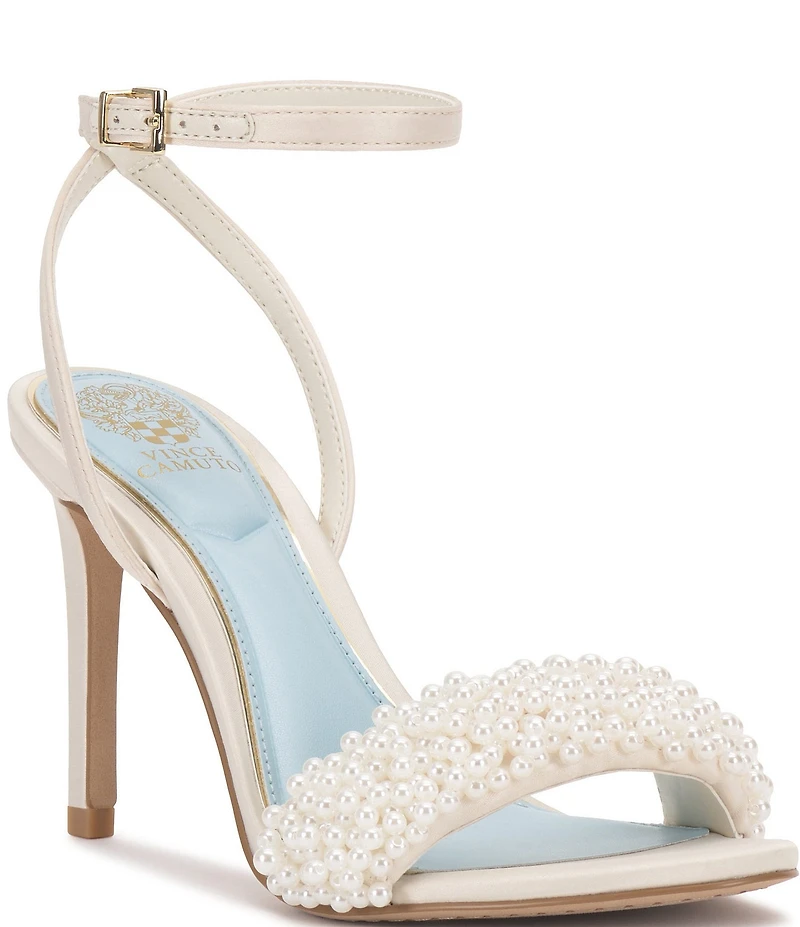 From Vince Camuto, the Arleem Beaded Band Ankle High Heel Sandals feature: Satin upper Buckle closure Synthetic lining Beaded detailing Rubber outsole Approx. 3.4" heel height Imported.