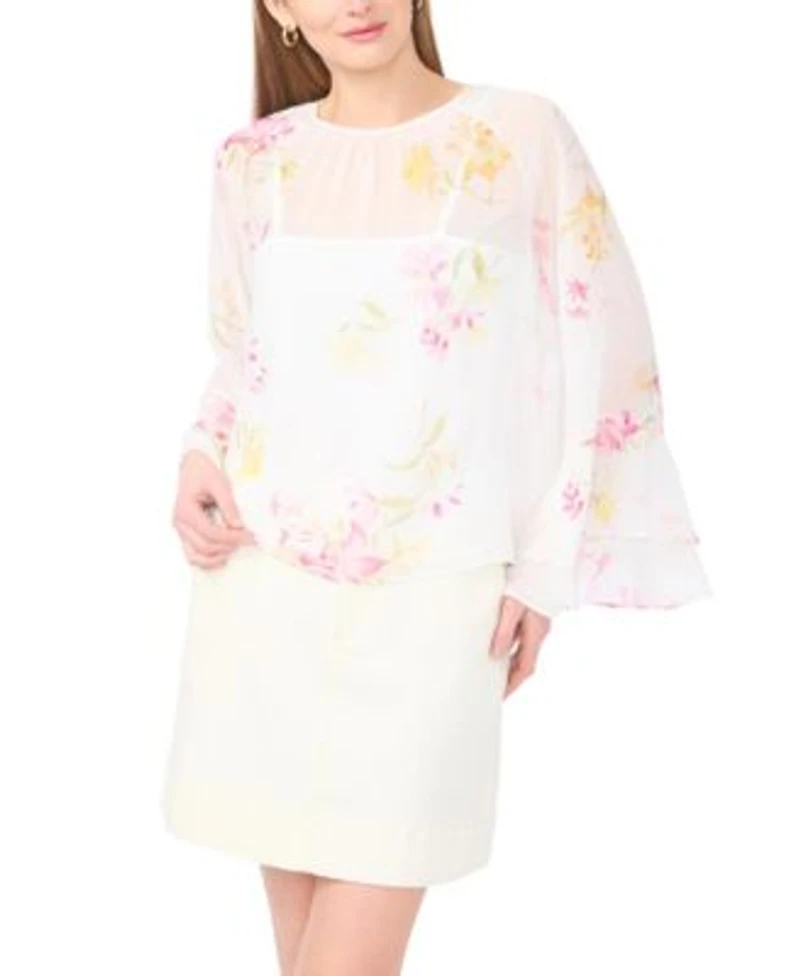 Add a dramatic flair to your outfit with this Vince Camuto blouse, featuring bell sleeves finished with tiered ruffles. The shirring at the neckline allows for a customizable, comfortable fit. About The Brand: Vince Camuto is a globally renowned brand that embodies European styling. Detailed craftsmanship across the line embraces current trends while maintaining a classic aesthetic.