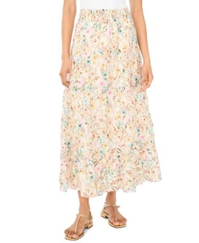 Flow with grace in this Vince Camuto tiered smocked maxi skirt, where an elastic smocked waistband provides a secure, comfortable fit. Tiered construction adds flowing movement, while pull-on styling and A-line silhouette ensure effortless wear. About The Brand: Vince Camuto is a globally renowned brand that embodies European styling. Detailed craftsmanship across the line embraces current trends while maintaining a classic aesthetic.