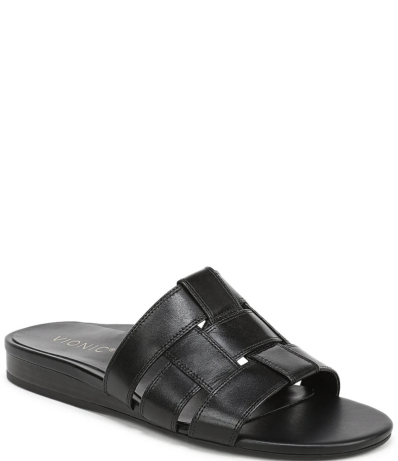 From Vionic, the Glendora Leather Mini Wedge Sandals feature: Premium leather upper Slip on styling Synthetic lining Built-in VIO MOTION Technology footbed featuring contoured arch support and a deep heel cup to provide stability & forefoot flexibility Lightweight, flexible midsole absorbs shock, reducing stress on feet, ankles & knees  Durable synthetic outsole Approx. 1" heel height It is recommended to wear your new pair for a few hours to allow your feet to adapt to the new support. Imported.