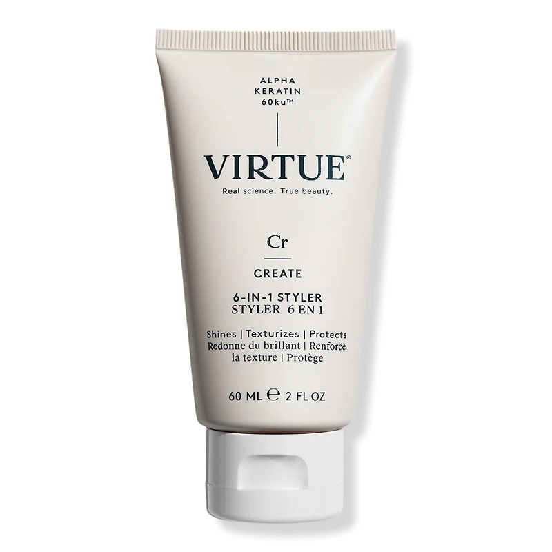 6 IN 1 STYLER TRAVEL 2FLOZ. Benefits: Hydrates Hair. Hair is softer, shiner and healthier. Polishes with Light Hold. Protects from Heat and Humidity. Features: For Hair Concerns: Lacks control, dryness, dullness, frizz. For Hair Types:. STRAIGHT - Fine/Medium/Thick. WAVY - Fine/Medium/Thick. CURLY - Fine/Medium/Thick. COILS - Fine/Medium/Thick. Key Ingredients: All Virtue products contain Alpha Keratin 60ku, a healing protein that's identical to the keratin that makes up 90% of hair. It repaves and refills keratin, repairing damaged hair with each use..