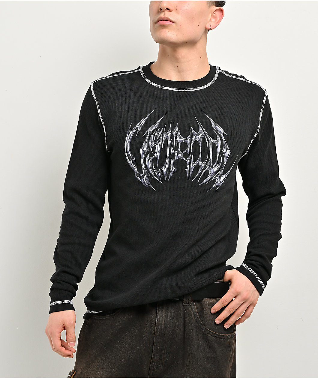 The designers at Vitriol introduce the Rebuff long sleeve t-shirt in a black colorway and warm thermal knit construction. White contrast stitching throughout adds alternative flair to the mall goth top, which showcases faux chrome branding on the fro