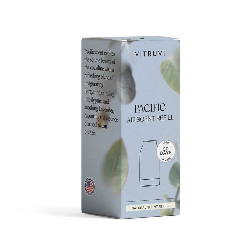 Pacific Air Scent Refill. Features: Pacific scent evokes the serene beauty of the coastline with a refreshing blend of invigorating Bergamot, calming Eucalyptus, and soothing Lavender, capturing the essence of a cool ocean breeze. Perfect For: Creating a serene and calming atmosphere Unwinding after a long day Enhancing relaxation rituals Bringing the soothing essence of the ocean into your home For use with Vitruvi Air Waterless Diffusers. : :