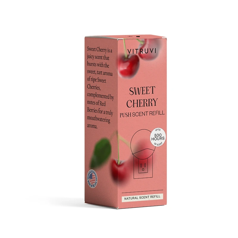 Sweet Cherry Push Scent Refill. Features: Sweet Cherry is a juicy scent that bursts with the sweet, tart aroma of ripe Sweet Cherries, complemented by notes of Red Berries for a truly mouthwatering aroma.. Perfect For: Adding a sweet and fruity aroma to your space Creating a cheerful and uplifting atmosphere Brightening up any room with a juicy scent Enjoying moments of playfulness and nostalgia. For use with Vitruvi Push Plug-In Wall Diffuser. : :