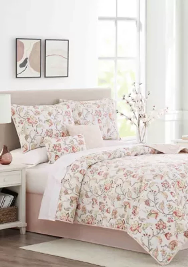 This floral 6-piece quilt set from Modern. Southern. Home.™ has a beautiful print of a soft spring floral design. - Full Set Includes: - Full Size Quilt: 76" x 88" - 2 Standard Shams: 20" x 26" + 2" - Bed Skirt: 54" x 75" + 14" - Decorative Pillow Cover: 12" x 18" - Decorative Pillow Cover: 16" x 16" - Queen Set Includes: - Queen Size Quilt: 88" x 88" - 2 Standard Shams: 20" x 26" + 2" - Bed Skirt: 60" x 80" + 14" - Decorative Pillow Cover: 12" x 18" - Decorative Pillow Cover: 16" x 16" - King Set Includes: - King Size Quilt: 102" x 88" - 2 King Shams: 20" x 36" + 2" - Bed Skirt: 78" x 80" + 14" - Decorative Pillow Cover: 12" x 18" - Decorative Pillow Cover: 16" x 16" 6-piece set Firmness: soft Imported Belk Exclusive Material & Care Polyester fill Polyester Machine washable