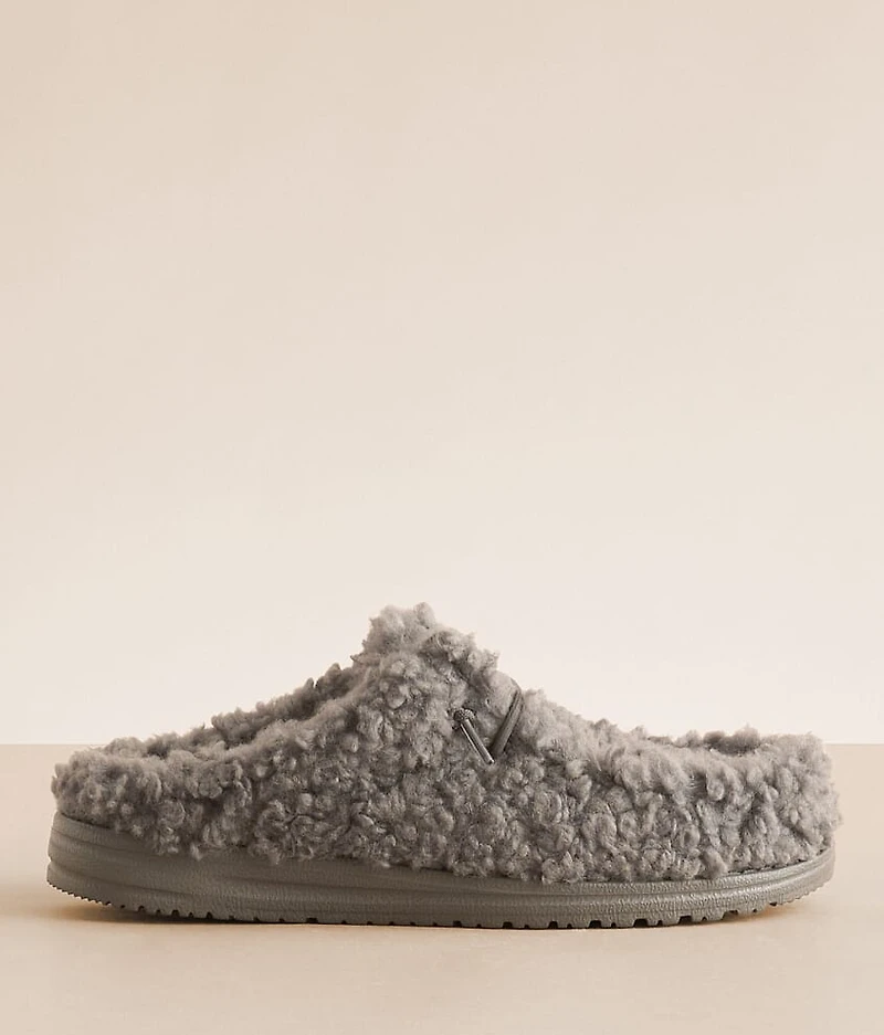 Sherpa slipper Stretch drawcord laces Cushioned foam footbed Flex & fold technology