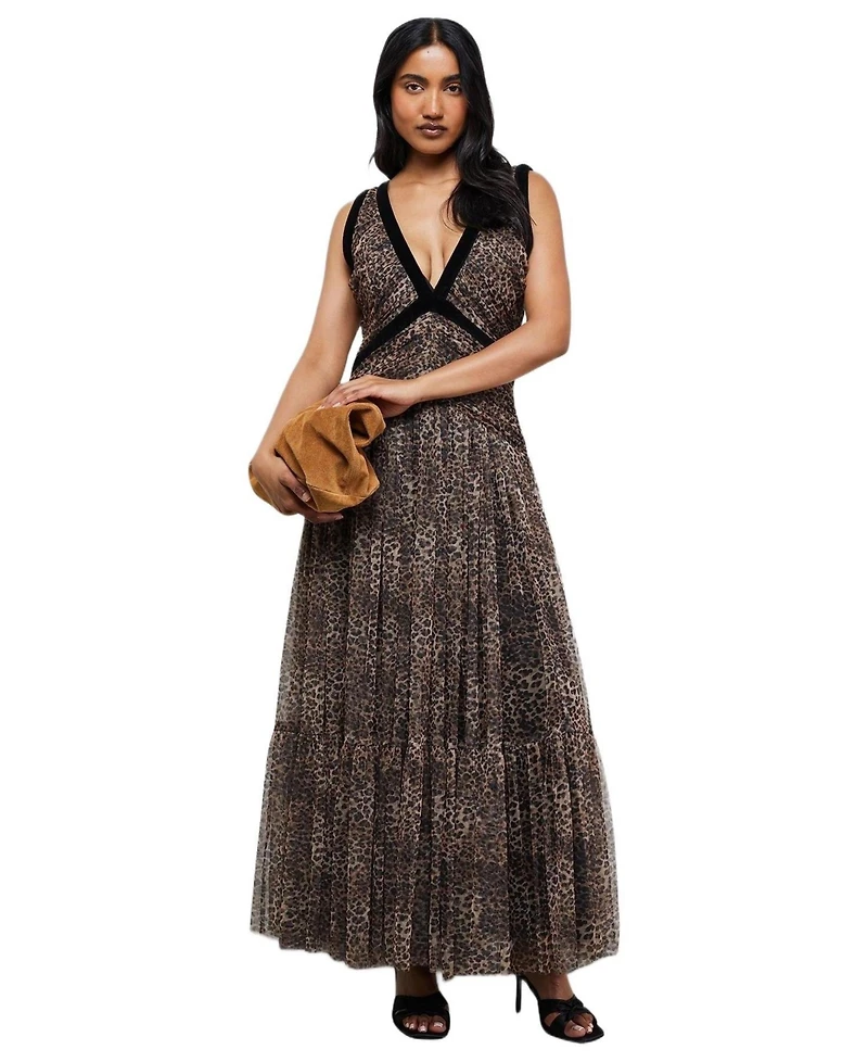 Warehouse Women's Velvet Trim Leopard Tulle Maxi Dress