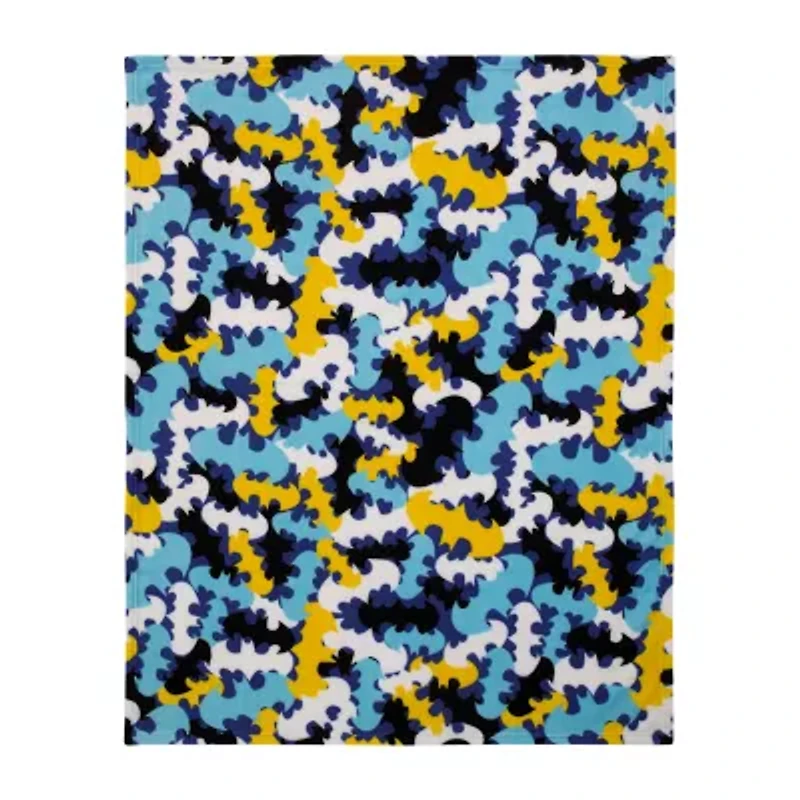Batman the caped crusader super soft toddler blanket measures 40" x 50" and is the perfect size for naptime, nighttime and cuddling. This allover bat-signal pattern has a camouflage look and is designed in bold shades of aqua, navy, black and yellow with an aqua trimmed edge. Makes a great toddler gift! Coordinates with batman the caped crusader toddler bedding and accessories.