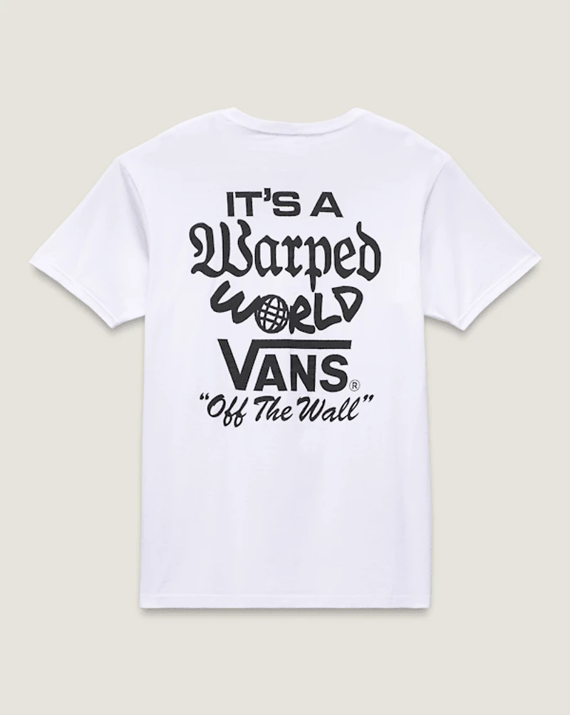 Take a skewed view in the Warped World T-Shirt, a classic fit short sleeve crew neck T-shirt with a screenprinted graphic of the Vans® logo on the front, and a statement-making graphic on the back.