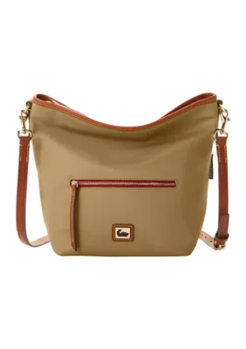 This compact crescent crossbody from Dooney & Bourke is crafted from lightweight nylon, making it easy to clean and maintain. Its All-American style features a practical twist, with an exterior zip pocket for quick access to essentials. The spacious interior boasts an additional zip pocket, two slip pockets, and a key hook for organization. The crossbody strap provides comfortable hands-free wear, making this bag perfect for everyday use. Zip closure Crossbody strap with 25" drop Exterior: 1 zip pocket Interior: 1 zip pocket, 2 inside pockets, key hook Imported Product Specifications 7" H x 5.25" W x 8" L Material & Care Nylon Clean with a soft cloth