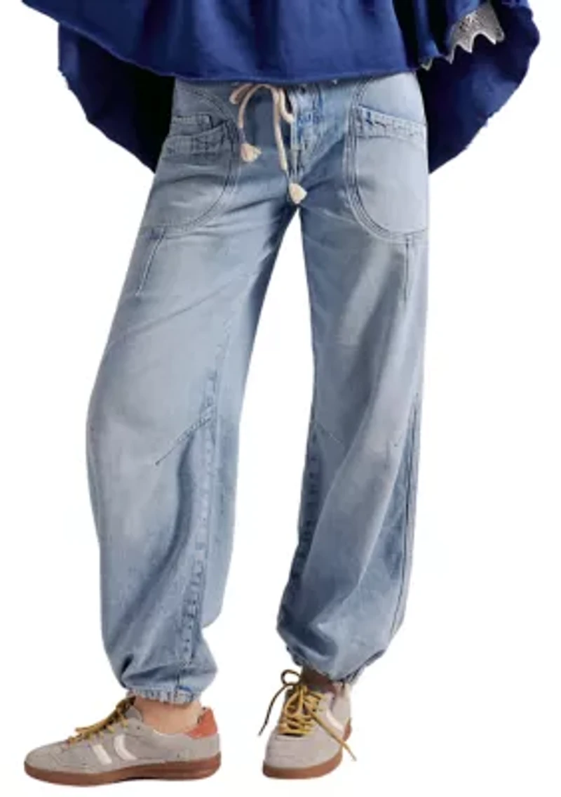 The perfect easy pair, these low-and-loose jeans from Free People's We The Free collection are featured in a pull-on style with a drawcord waistband and cuffs for that cool, customizable fit. Fit: Low-rise, low-slung, pull-on style, boyfriend silhouette Feel: Classic rigid denim Features: Five-pocket design, rounded seamed details, drawcord waistband and cuffs, button-fly closure Boyfriend/Girlfriend fit Tapered leg Product Specifications 30" inseam Material & Care Cotton, tencel Machine washable