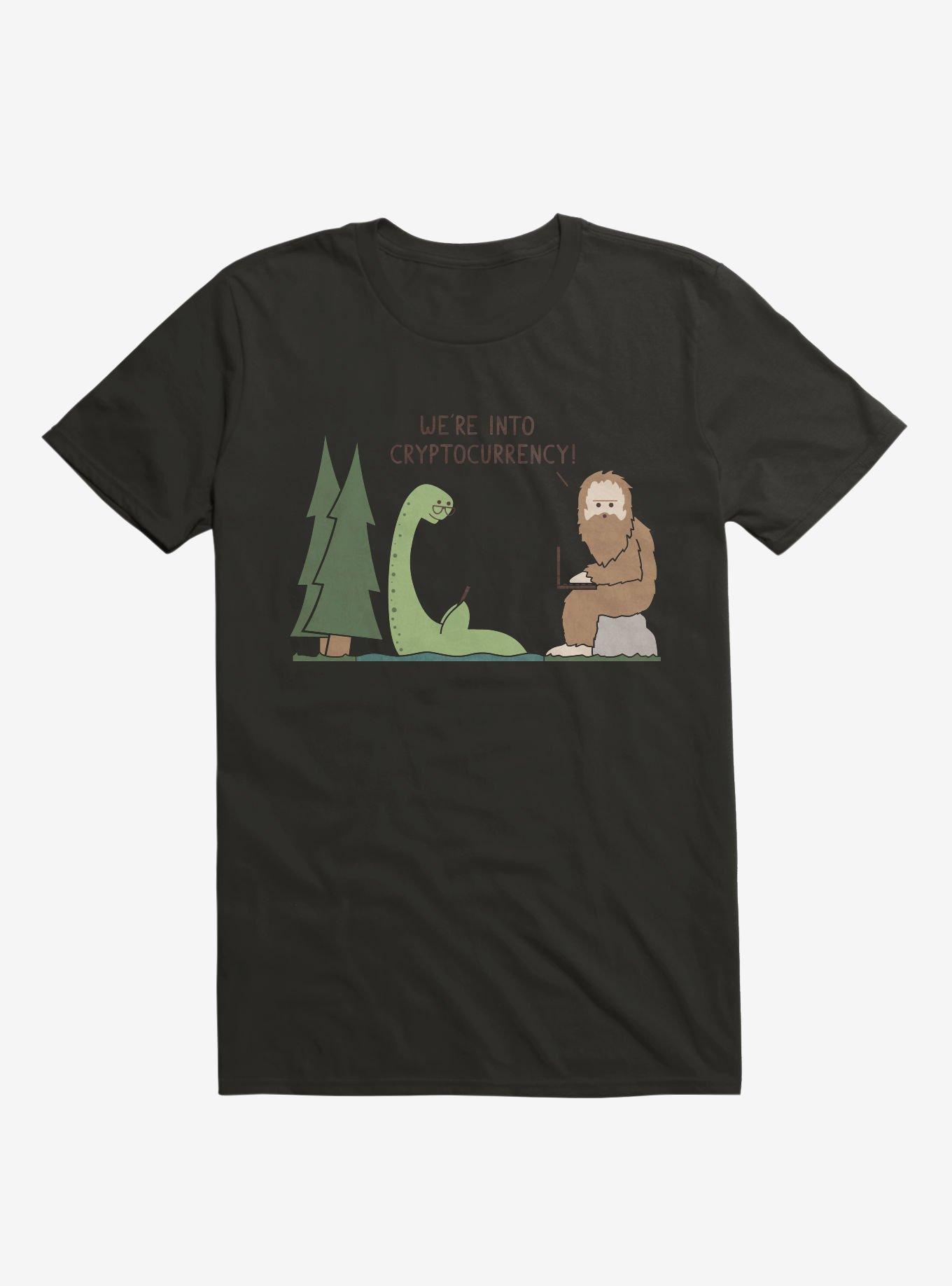 Digital cash is where it's at... just ask these urban legends. The Loch Ness Monster and Bigfoot are all about cryptocurrency on the front of this lightweight black tee. Officially licensed art from handsoffmydinosaur.