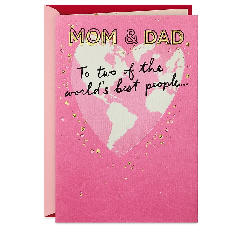 Valentine's Day greeting card for your mom and dad features a heart-shaped globe surrounded by a galaxy of shimmery gold foil hearts on a pink background. The sweet message of love and gratitude lets them know how much they mean to all of you.