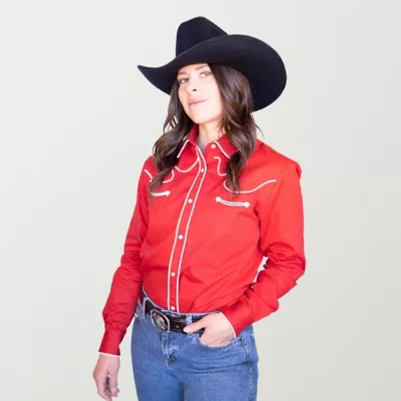 This western express women's black western shirt is 100% cotton twill with pearlized snaps, white piping detail, and functional smile chest pockets.
