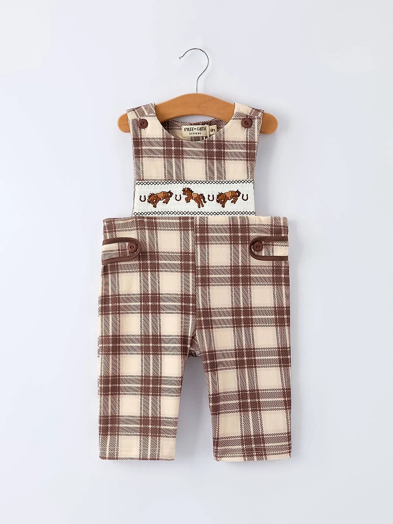 This charming romper combines classic Western style with timeless baby boy appeal. Featuring intricate horse embroidery and delicate smocking details, the plaid pattern adds traditional character perfect for special occasions or everyday wear. Crafted with comfort in mind, this one-piece design offers easy dressing and diaper changes. The quality construction ensures durability through multiple wears and washes, making it an heirloom-worthy piece that can be passed down or treasured in photos. Ideal for parents seeking distinctive, well-made clothing that stands out from standard baby apparel. body:95% Polyester,5%Spandex combo:80% Polyester,20% Cotton