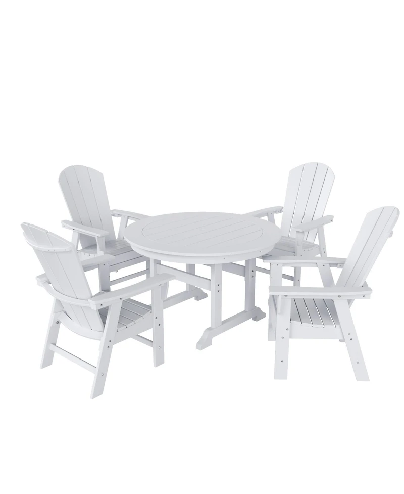 Impress your loved ones at your next outdoor family dinner with the 5-Piece outdoor dining set. This all-weather set seats up to four and features curved-back dining chairs with the look of Adirondack design. With a durable round dining table, this set is perfect for casual outdoor dining.